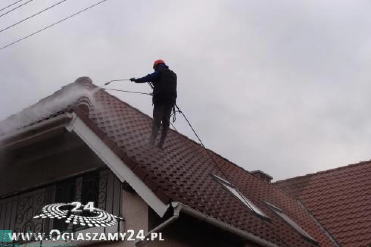 Mycie dachów z zastosowaniem profesjonalnych myjek wysokociśnieniowych oraz specjalistycznej chemii.