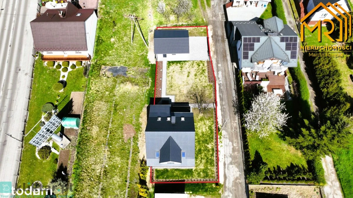 Z zewnątrz posesja została starannie zagospodarowana – chodniki przeciwpożarowe, taras wyłożony deską kompozytową oraz nowo wybudowany garaż z automatyczną bramą na pilota. Zarówno budynek mieszkalny, jak i garaż wyposażono w energooszczędne oświetlenie LED. Teren w całości ogrodzony, z bramą wjazdową również sterowaną pilotem. Dla dodatkowego komfortu i bezpieczeństwa zainstalowano domofon.